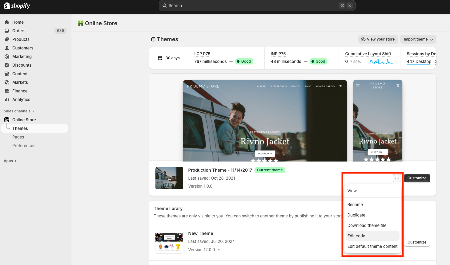 - On your current theme, click Actions > Edit code.